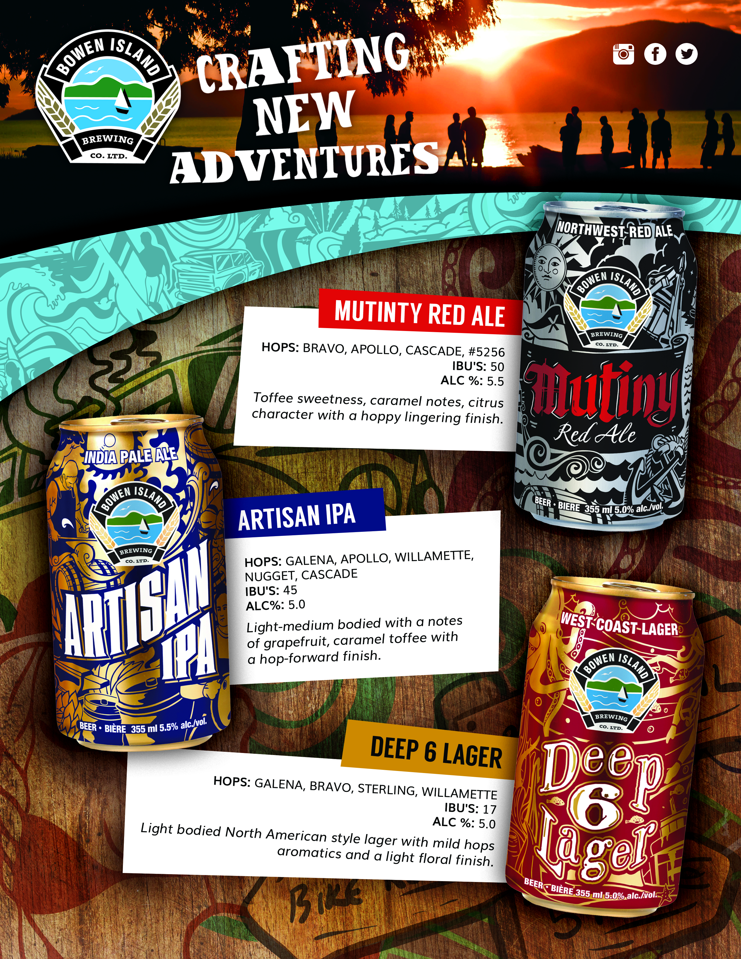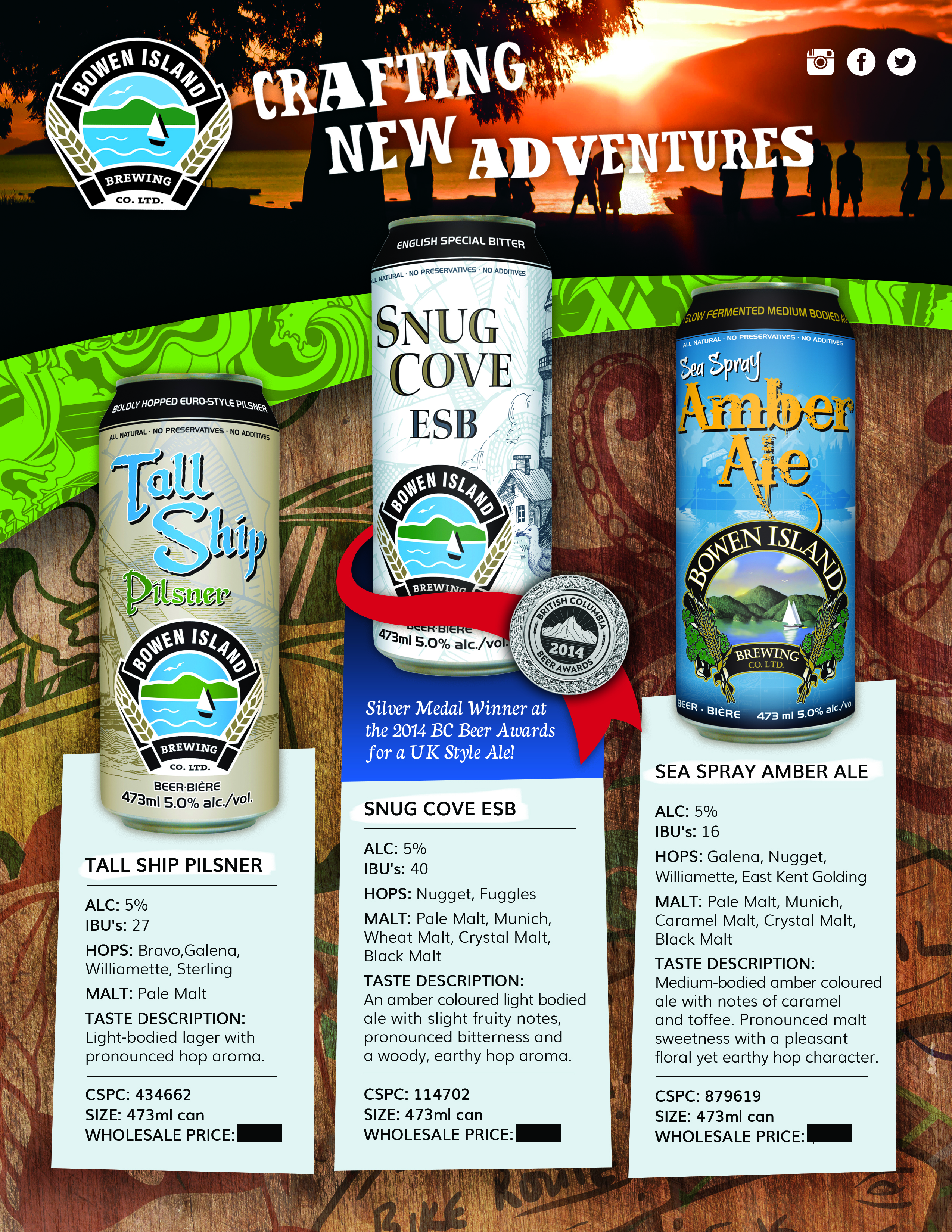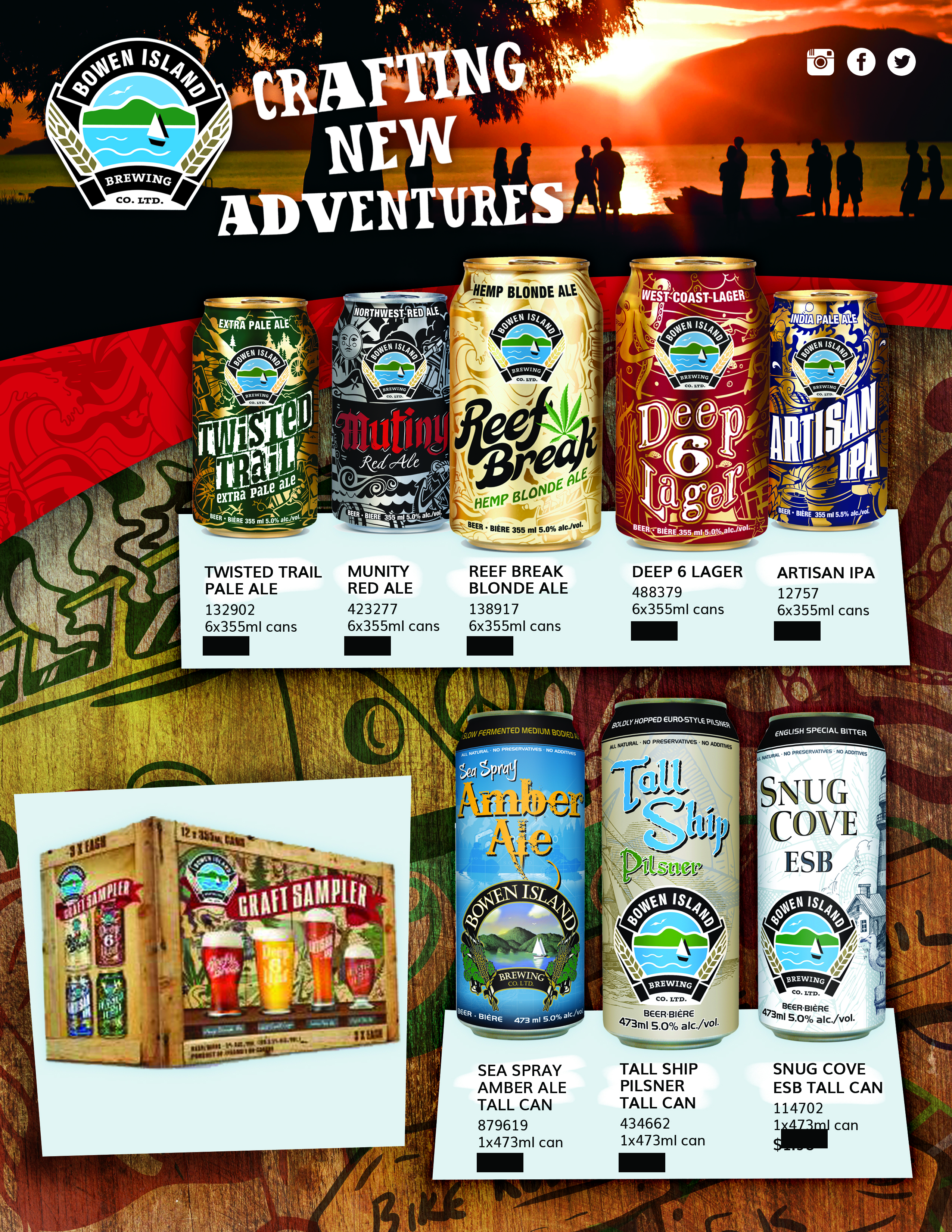 Internal sell sheet for all Bowen Island Brewing brands. Prices have been blacked out for privacy reasons, and bottom left ‘sampler box’ area is left blank until information is provided.
