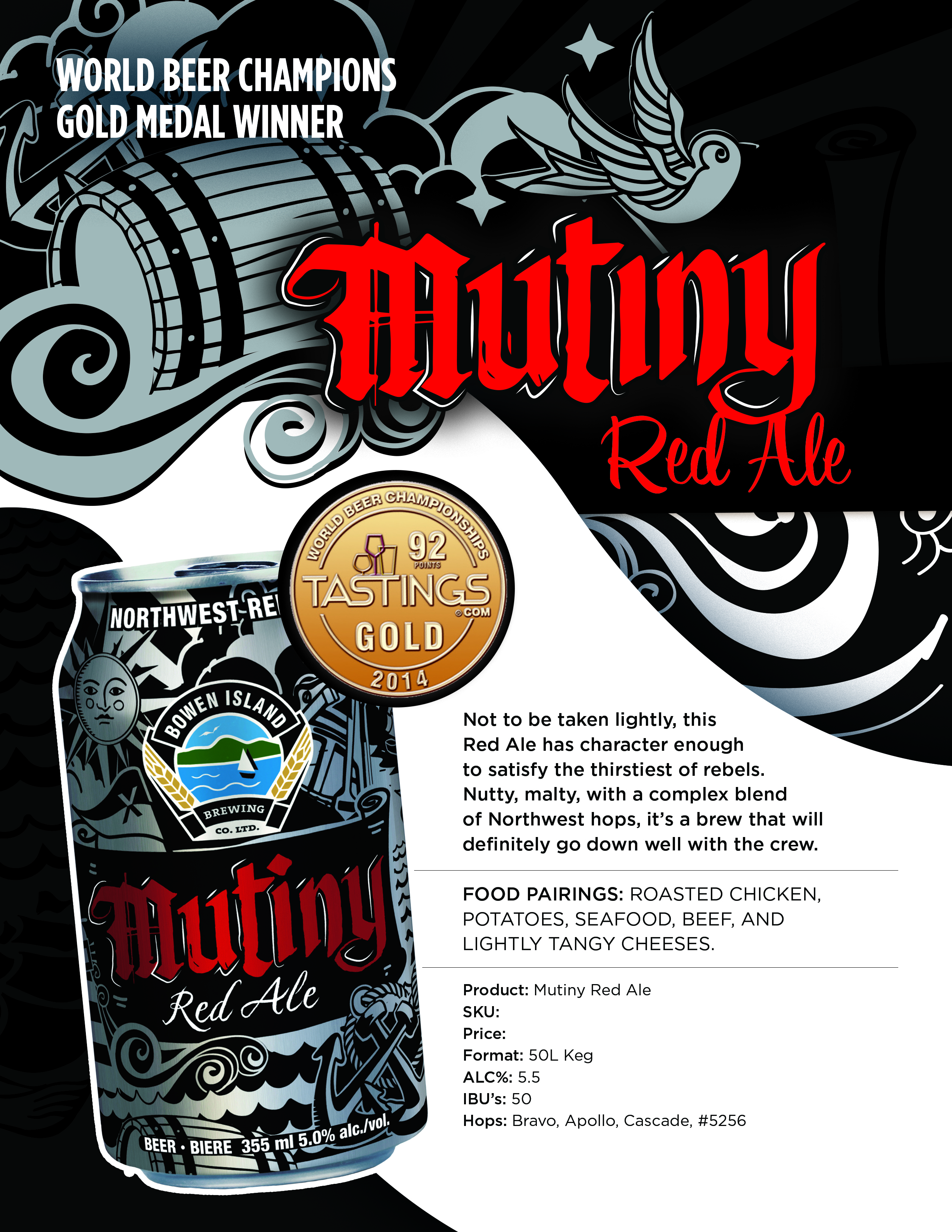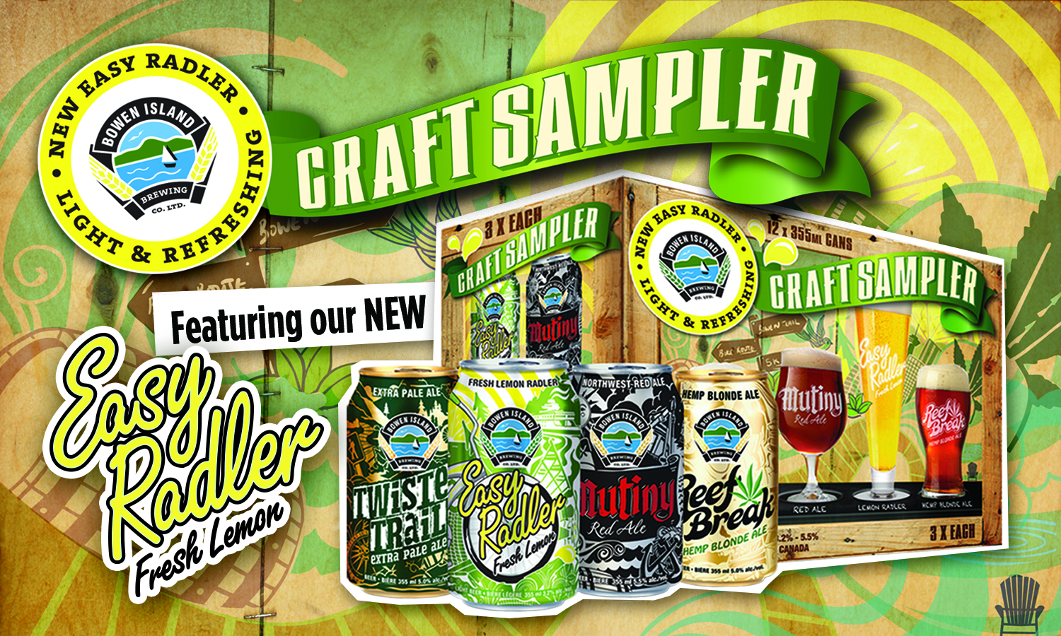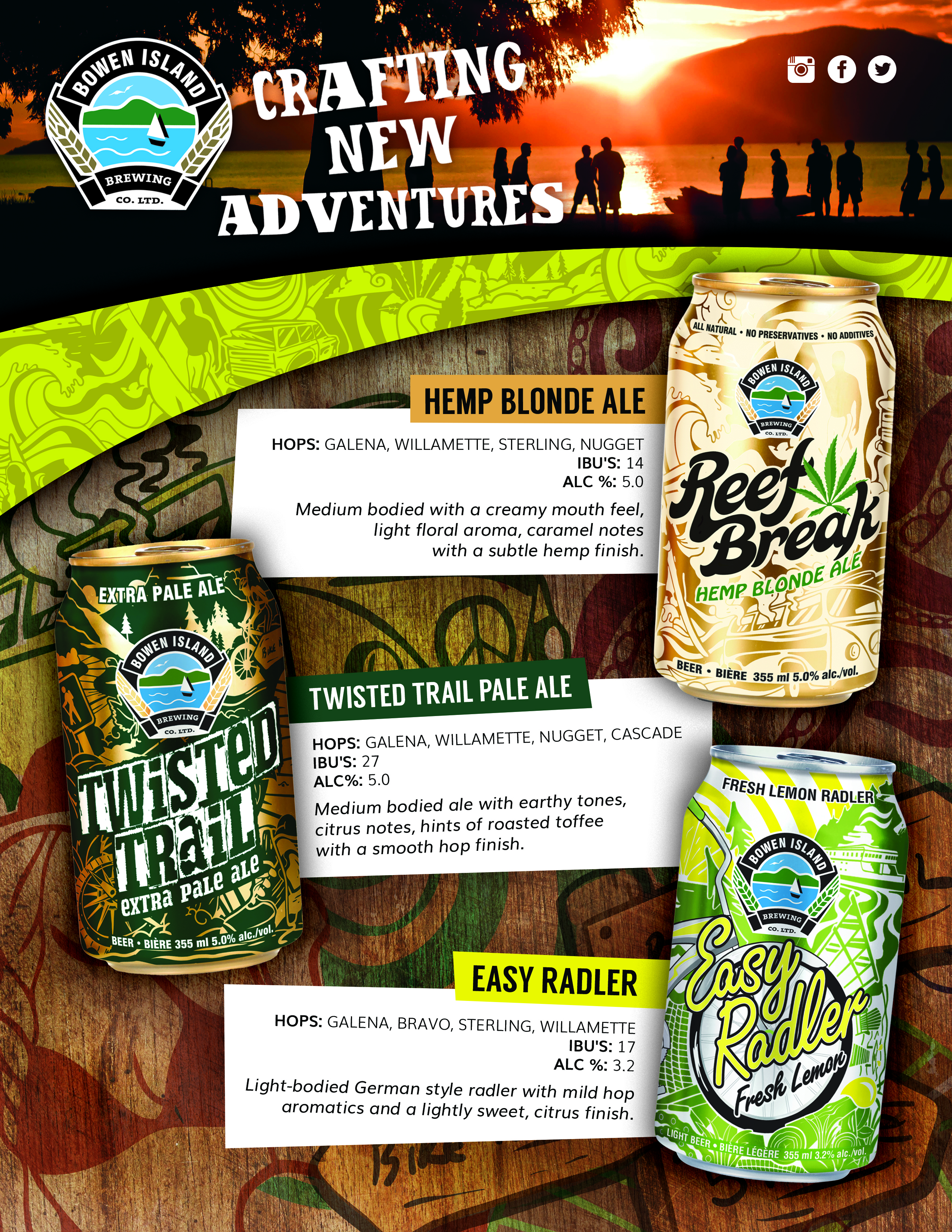 Internal sell sheet for all Bowen Island Brewing brands. Prices have been blacked out for privacy reasons, and bottom left ‘sampler box’ area is left blank until information is provided.