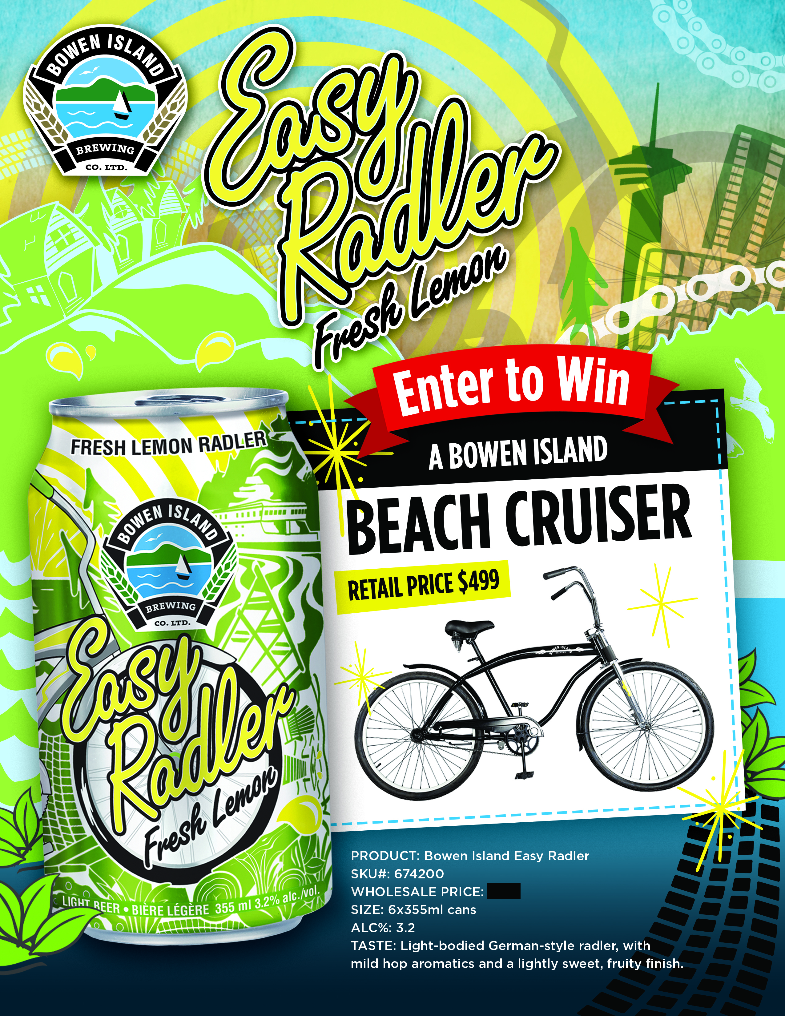 Bowen Island Easy Radler ‘win a beach cruiser’ promo sell sheet.