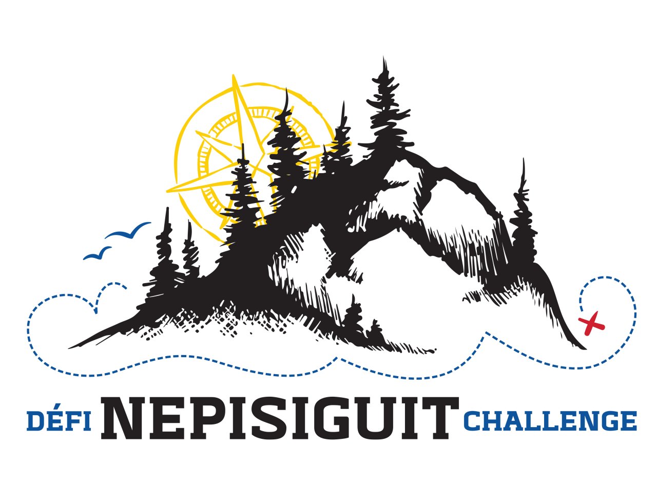 Illustrated logo for the Nepesiguit Challenge, a 140km ‘adventure’ triathlon in New Brunswick. The elements have double meanings: the sun is a compass, which is needed for this race; the waves are also a dotted path showing the start and destination points; and the three colours are MicMac heritage colours.